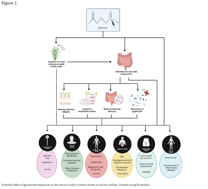 “In animals, glyphosate has been reported to negatively impact the gut, the cardiovascular system, the endocrine system, the reproductive system, the central nervous system, and immune system (outlined in Figure 2). However these studies did not examine the effect of glyphosate on the gut microbiome of their selected animal model. Therefore, in these instances it is impossible to determine if alterations to the gut microbiome were an impacting factor in disease manifestation. It is also worth mentioning the difference between the gut microbiome of humans and animal models and how for this reason results obtained in animal models may not reflect results in humans.” [24]